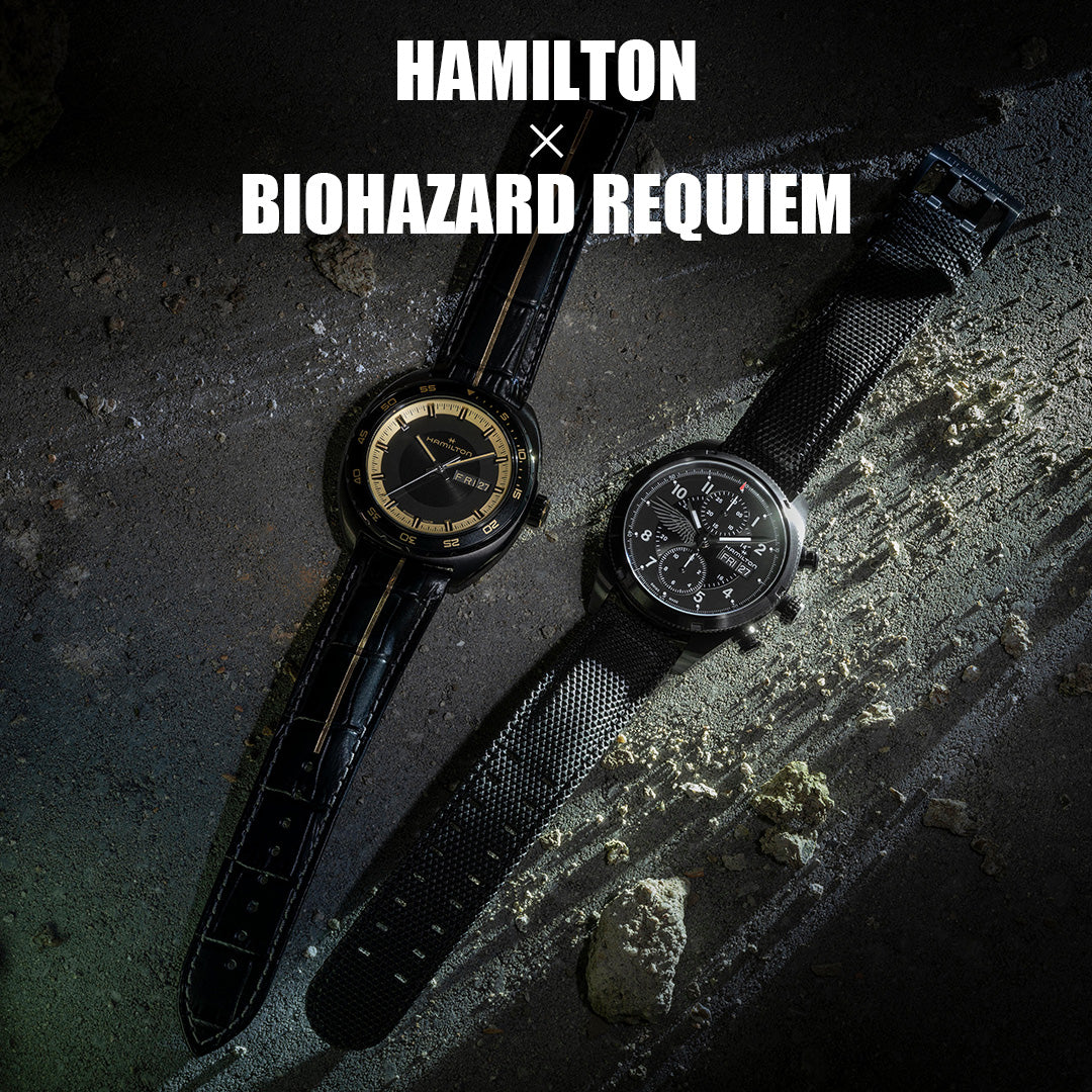 各2000本限定、2026年2月27日に『バイオハザード レクイエム』リミテッドエディションが発売。新たなコラボレーションを通じて、ゲームの世界におけるクリエイティブな存在感をさらに発揮します。作品の世界観やキャラクター、そしてファンのためにデザインされた2モデルです。 ハミルトンとカプコンのコラボレーションは、単なる企業同士のタイアップではありません。ハミルトンが長年、映画やゲームといったエンターテインメントの世界で積み重ねてきた“物語とともに時を刻む”という姿勢が、そのまま息づいています。 『インターステラー』や『テネット』のために特別に作られたモデルは、作品の世界観をより深く、よりリアルに感じさせてくれました。キャラクターが身に着ける時計が、ただの小道具ではなく、その人物の人生や選択を象徴する存在として輝くそんな瞬間を、ハミルトンは何度も生み出してきたのです。 そして今回の『バイオハザード レクイエム』では、その伝統がさらに力強く広がっています。恐怖と緊張が支配する世界で、ハミルトンのタイムピースは“生き延びるための時間”を静かに、しかし確かに刻み続けます。極限状態での一秒一秒がどれほど重いものなのか、その感覚を時計が代弁しているかのようです。 エンターテインメントと時計づくりを融合させるハミルトンの姿勢は、今回のコラボレーションによってさらに鮮明になりました。作品の世界に寄り添いながら、ブランドとしての存在感も深めていく、その両立が、ハミルトンの魅力をより一層引き立てています。 American Classic Pan Europ American Classic Pan Europ H35455730 価格¥195,800 (税込) 発売日:2026年2月27日 商品を見る グレース・アッシュクロフトが着用する「パン ユーロ」は、彼女の知性と法医学捜査官としての分析力を象徴し、レオンのタイムピースと個性の異なるトーンをまとった一本です。ストラップの中央にはブラックを基調にゴールドのラインが走り、このモデルで初めて採用された新しい仕上げです。ケースバックには幾何学的なモチーフが刻まれています。ダイヤルのアラビア数字や外周のリングもゴールドで統一され、「ゴールド&ノワール」のコントラストが、真実を解き明かすというグレースの使命感の強さと洗練さを同時に表現しています。 Khaki Field Auto Chrono KHAKI FIELD Auto Chrono...