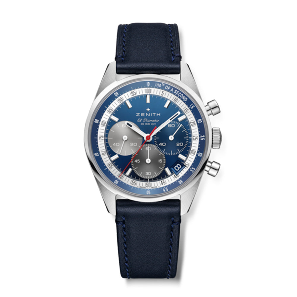 サンレイパターンを施したブルー文字盤、3色カウンター |