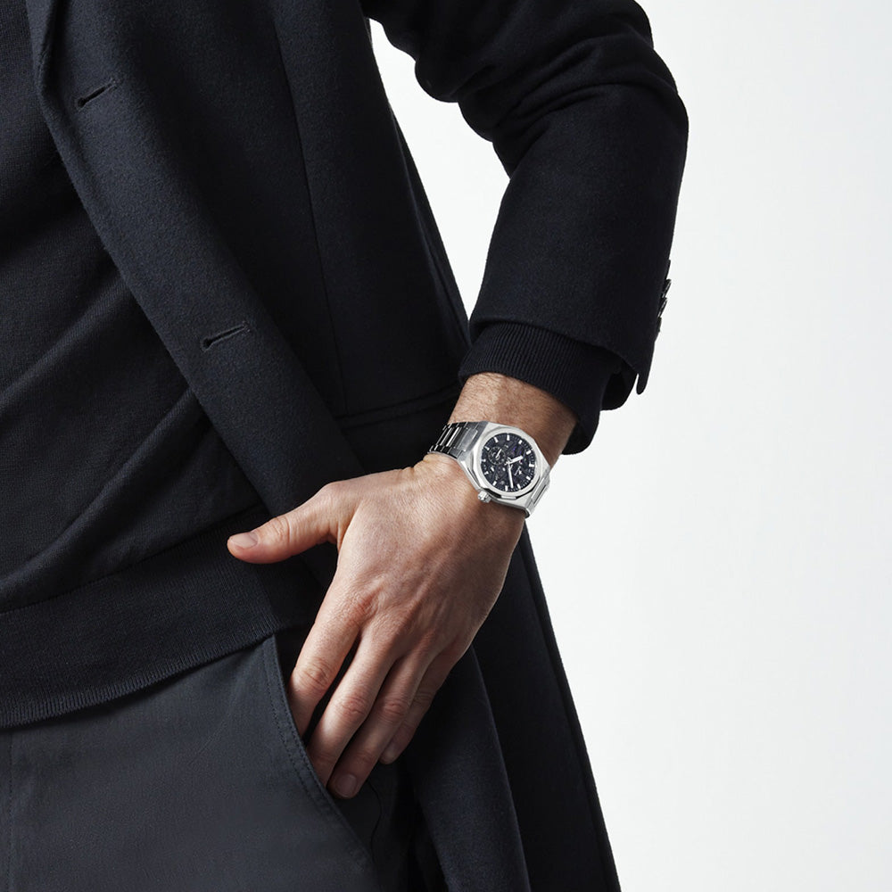 デファイ スカイライン スケルトンでは、ファセットカットのベゼルを配した41mmスチール製の八角形のケースを使用し、ブルーのオープン文字盤にはゼニスの象徴である4つの点を結んだ星を復刻させてあしらっています。1/10秒精度を誇る初のインジケーターを備えた高振動エル・プリメロ 3620 SK 自動巻スケルトンムーブメントを搭載。クイックストラップチェンジ機構を備え、スチール製ブレスレットとブルーラバーストラップが付属。 セカンドストラップが付属しているため、ストラップ交換システムを存分にご体験いただけます。