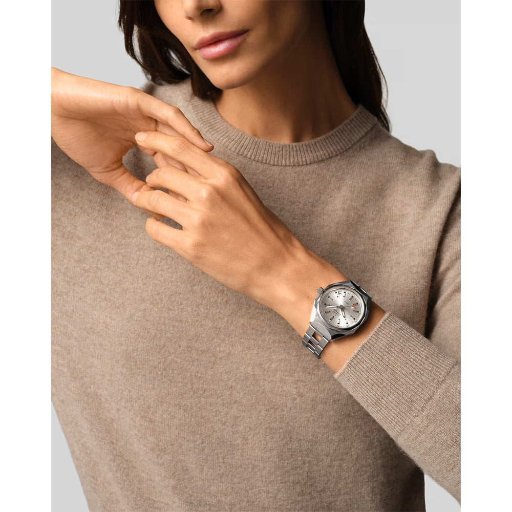 サンレイパターンを施したシルバートーン文字盤 |