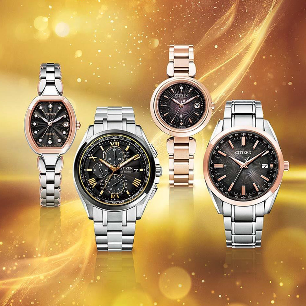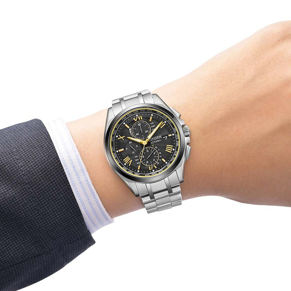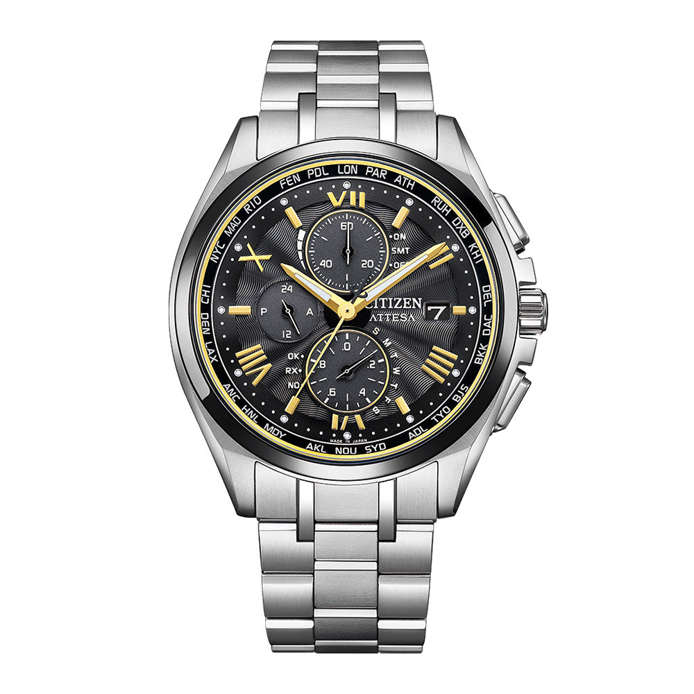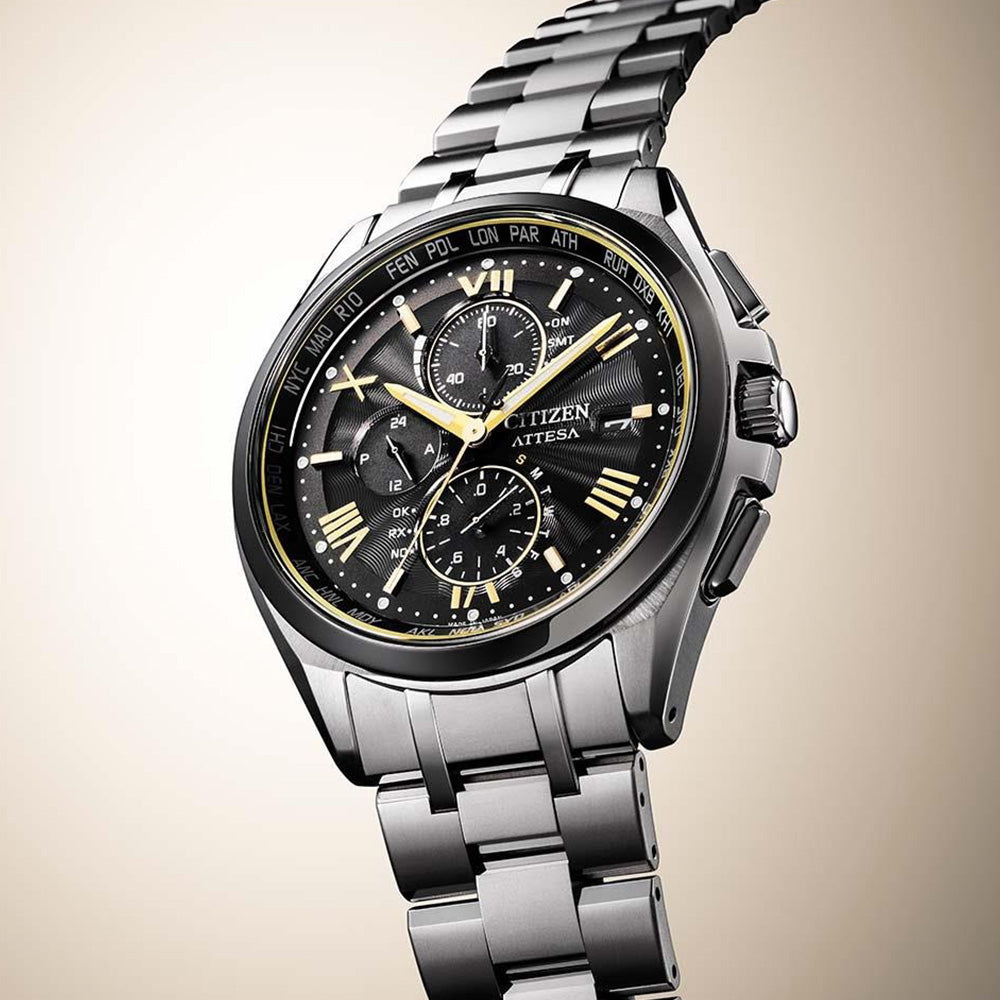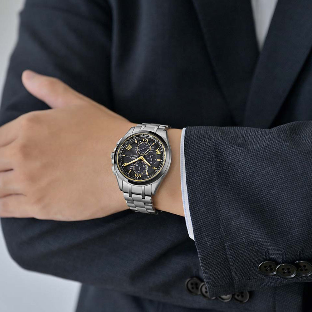 ロングセラーの人気モデル「AT8040」をベースに、文字板の中心から光が伸びるあしらいに。サンレイパターンを描いたブラックの文字板に、ゴールドのローマ数字インデックスを配置し、深い黒とゴールドのコントラストが上品で華やかな印象に仕上げています。ケースとバンドにはデュラテクトプラチナ、ベゼルにはデュラテクトDLCを採用し、全体の印象を引き締めました。サファイアガラスの外周には、蒸着で仕上げたゴールドのリングを施し、限定モデルならではの特別感を演出します。