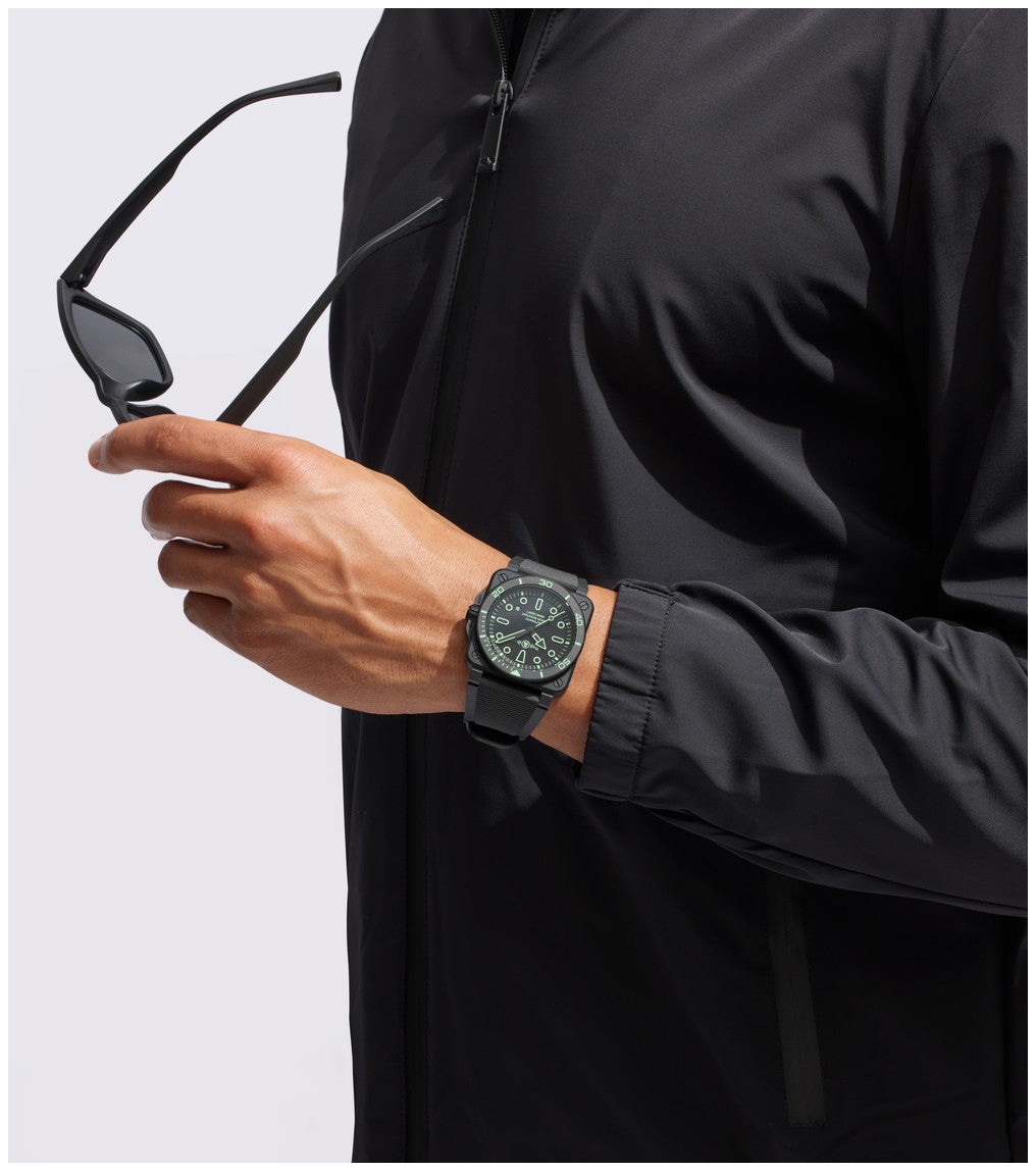 発光素材であるスーパールミノバは、暗闇での高い視認性を確保するという常に機能的な目的を果たしてきました。この技術的な特性は、航空世界や水中環境のプロフェッショナルにとって非常に重要な要素です。大胆で力強いBR-03 ダイバー ラム アウトラインは、発光特性を強調するラムコンセプトの核心を捉えながらも、輪郭だけを強調するという独自性溢れるデザインを特長としています。「照明看板のネオンのように、緑のスーパールミノバが針とインデックスの輪郭をトレースして照らします。まるでマットブラックの紙に緑のハイライターでこの文字盤を描いたかのような表現です。暗闇では、時刻マーカーが完璧に読み取れます。ここでは、スーパールミノバは昼夜を問わず、実用的で装飾的な視覚的シグネチャーです」とベル&ロスの共同創業者兼クリエイティブディレクターであるブルーノ・ベラミッシュは説明します。モダニスト建築とデザインの愛好家であり、「Less is more(レス イズ モア)」というルートヴィヒ・ミース・ファン・デル・ローエのモットーを受け入れ、ミニマリズムと機能美を称賛しています。