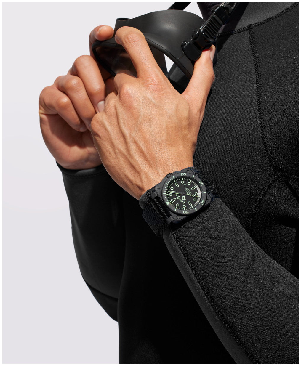 プロフェッショナルインストゥルメントのクリエーターであるベル&ロスは、極限の挑戦に挑み続けています。高高度ミッションに挑むパイロットの装備品を超えて、深海を舞台に挑戦することは必然でした。ブランド設立からわずか3年後の1997年、透明なフッ素オイルをケースに充填した「ハイドロマックス」で11,100メートルの耐水性の当時の世界記録を樹立しました。「絶対的な信頼性を要求するプロフェッショナルのために、BR-03 ダイバーコレクションはその革新的なレガシーを受け継いでいます」とカルロス・ロシロは述べています。発光技術を機能的な側面と美的な側面の両面で捉えることで、ダイバーズウォッチの新しい可能性を切り開きました。BR-03 ダイバー ラム アウトラインは、深海での冒険に挑む新しい相棒です。