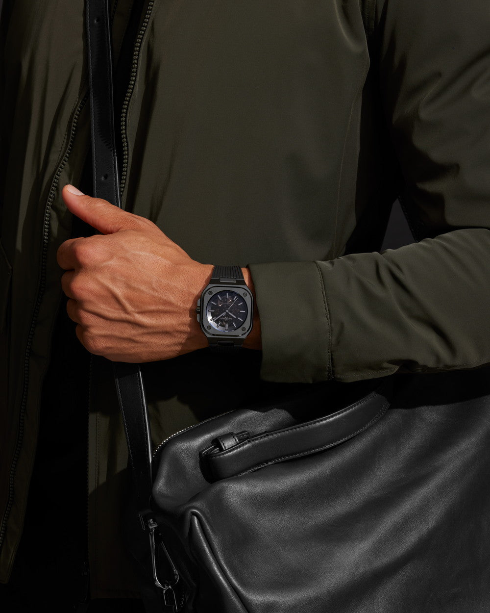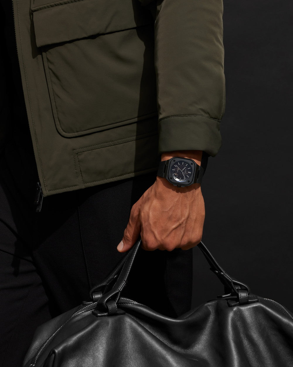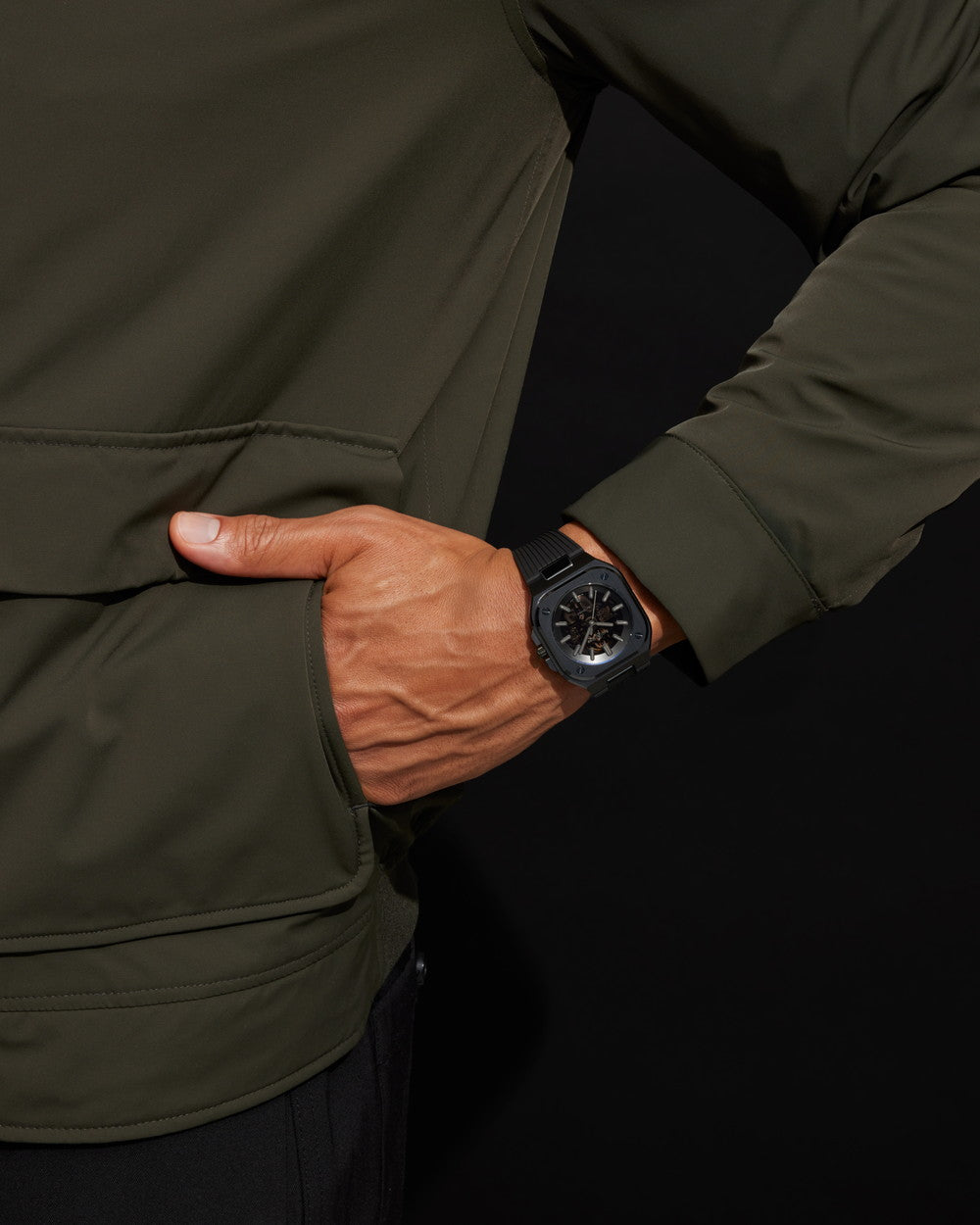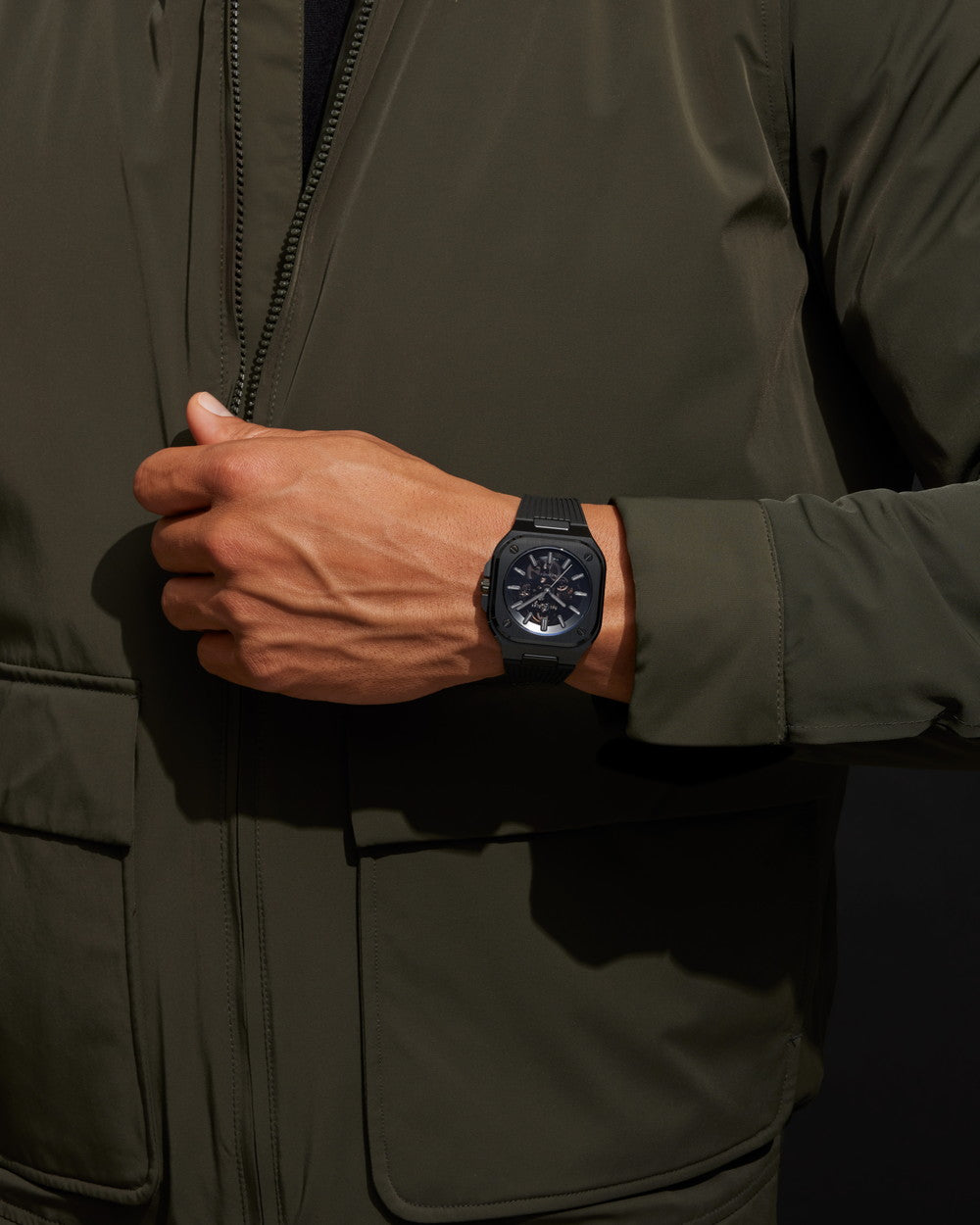 ブラック。スモークスケルトンプレートとロジウムメッキ仕上げのムーブメント。 グレーのSuper-LumiNova(緑色発光)を施したアプライドインデックス、時針、分針。ロジウムメッキ仕上げの秒針 |