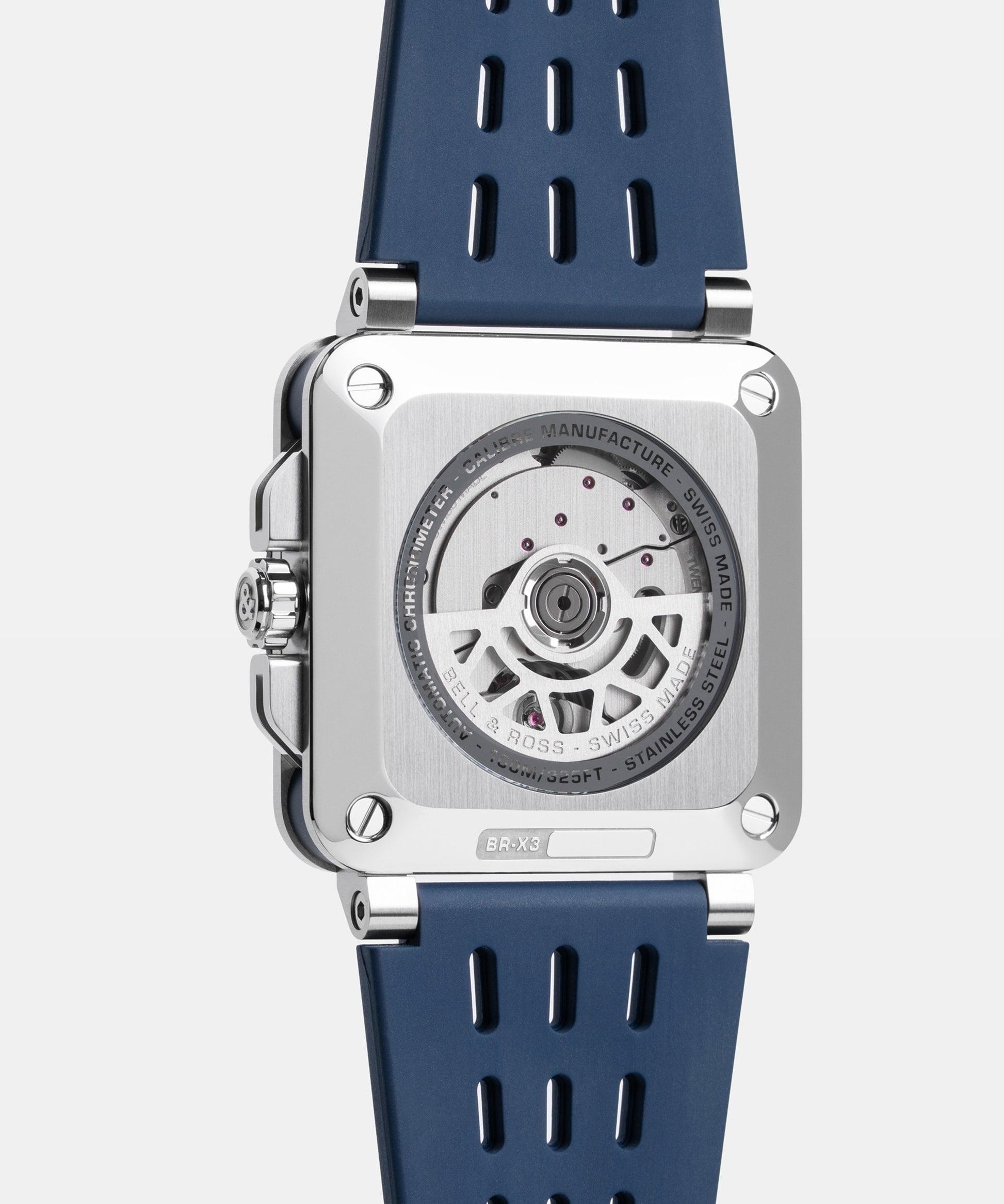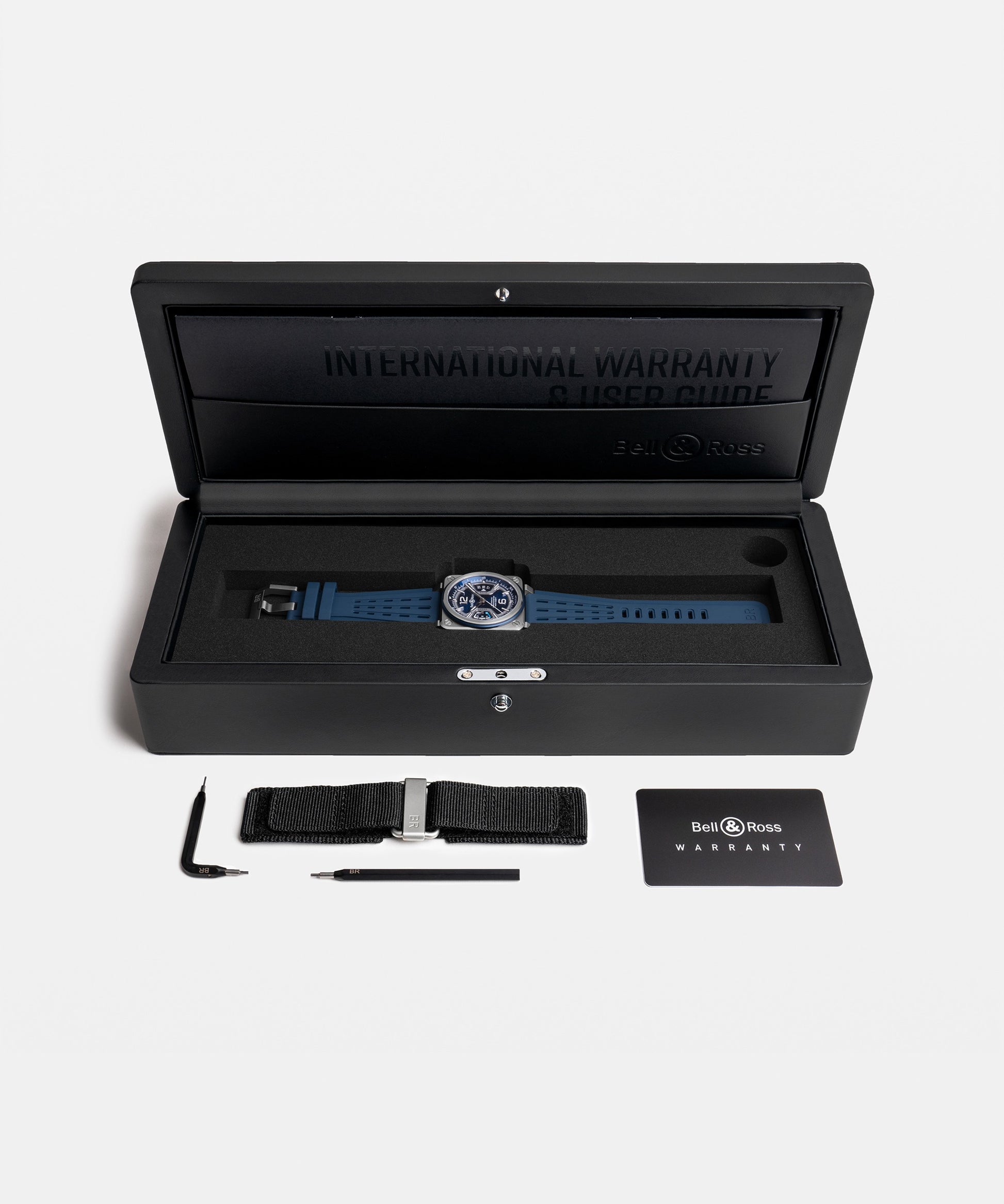 幅41 mm、厚さ13.30 mm。ポリッシュ/サテン仕上げステンレススティール。ねじ込み式リューズ。リューズガード。ブルーアルマイト処理のベゼル外周リングとケース四隅の装飾ピラー。サファイアクリスタルケースバック。 |