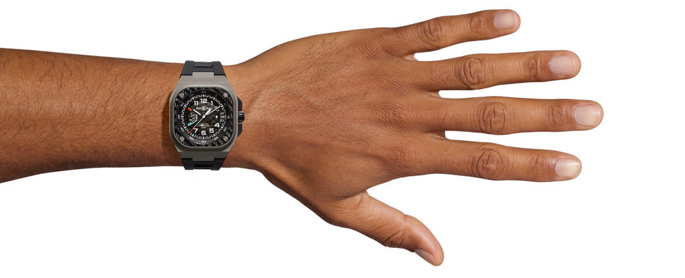 幅 41 mm。厚さ 12.80 mm。チタン。ねじ込み式リューズ。ブラック DLC(ダイヤモンドライクカーボン)コーティング リューズガード。ウーブン カーボンファイバー装飾ベゼル。ローター付きサファイア ケースバック。 |
