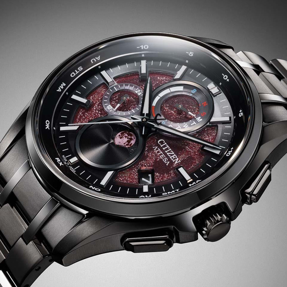 ダークレッドの文字板にインクジェット印刷で「Blood Moon」を彷彿とさせる模様とざらつき感を表現。その上に重ねた文字板と金属パーツが、立体感を生み出しています。ルナプログラムの機能により、月の満ち欠け(月齢)が表示される月齢板は、パール印刷を施すことで漆黒の夜空に浮かぶ、美しい「Blood Moon」が楽しめます。