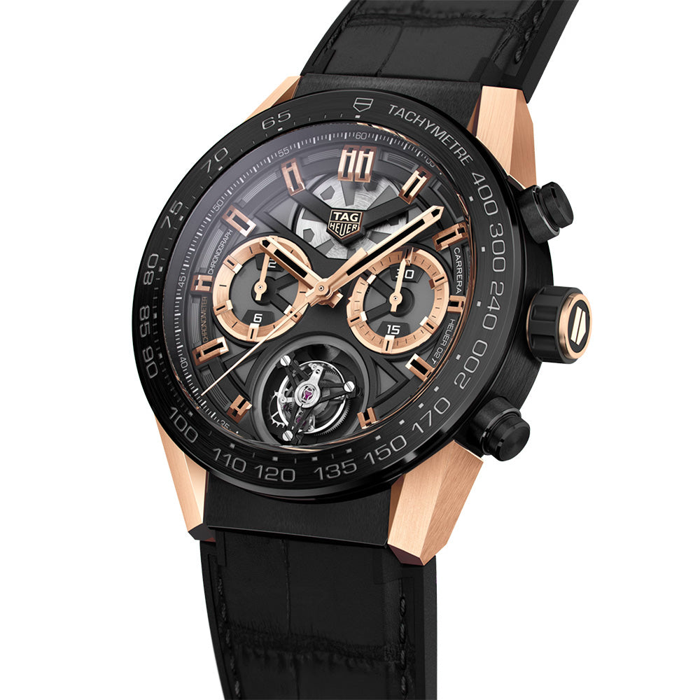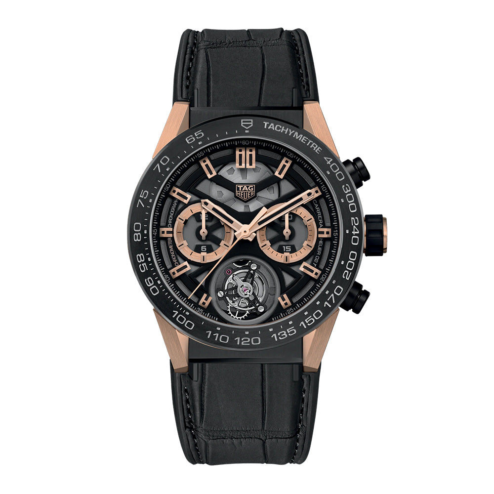 時, 分, クロノグラフ:1/4秒計、30分計、12時間計, 1分間に1回転するトゥールビヨン |