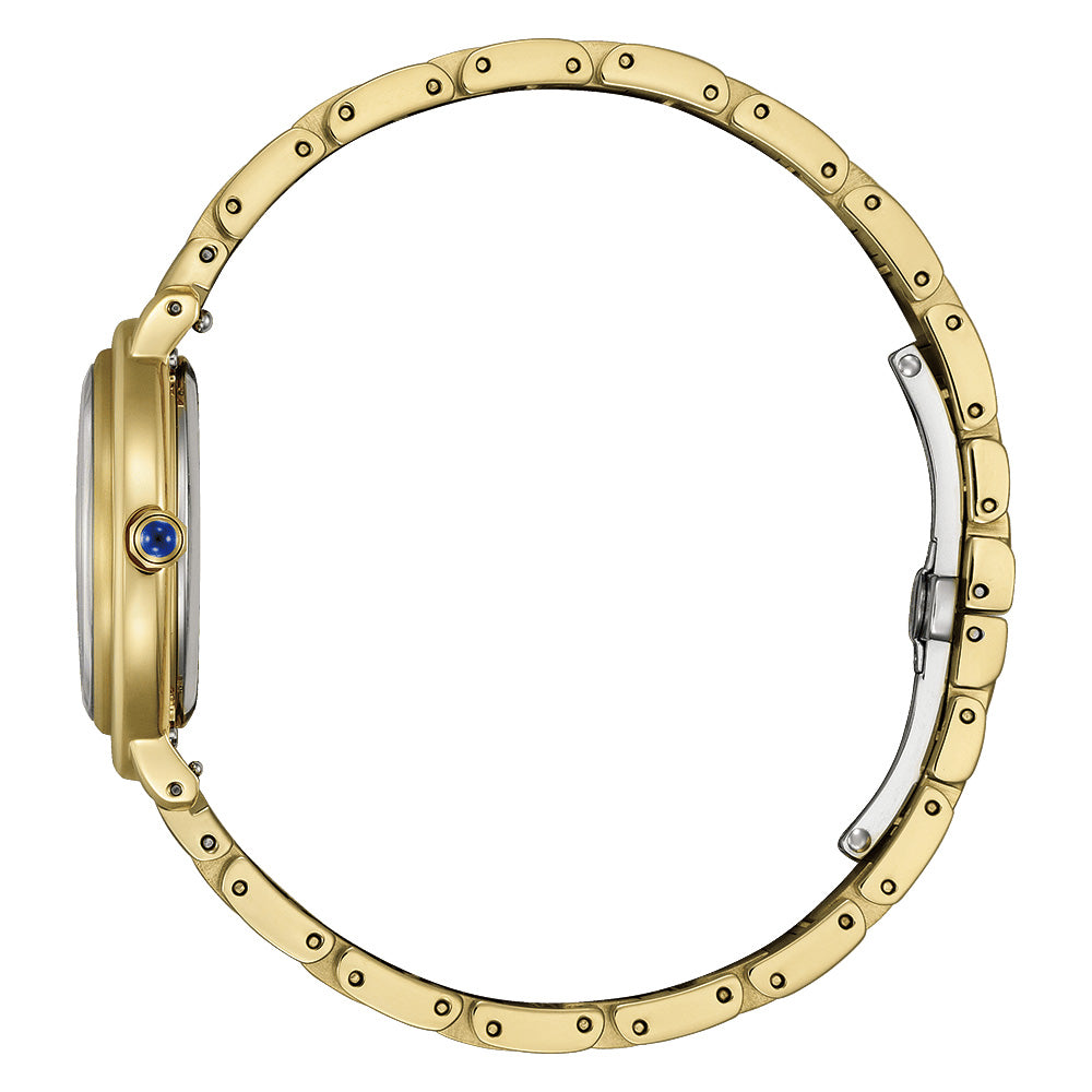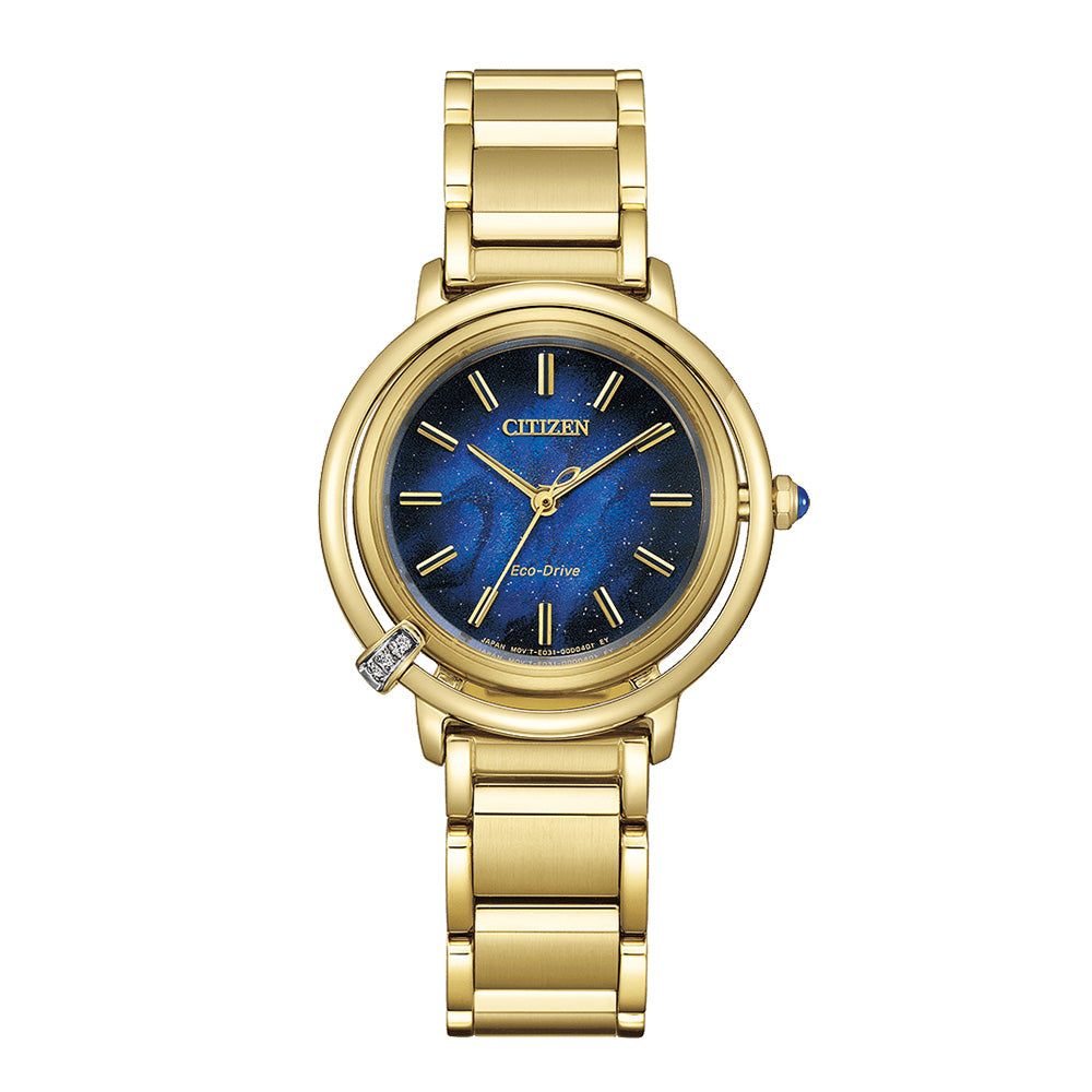 深い海から見上げた、煌めく水の波紋をイメージして、揺らめく青色の構造色文字板が、生命観溢れる神秘的な海を表現。シチズンの1960年代の時計からインスピレーションを得たデザインで、太めのバーインデックスと先端に向かってすっと細く伸びた針は、力強さと繊細さが調和した、洗練された印象を演出しています。ケースは、アンティークウオッチのような印象と上質感を漂わせるライトゴールドを採用し、3ポイントのダイヤモンドを配置。ジュエリーのような美しさの中にどこかマニッシュな印象を残します。