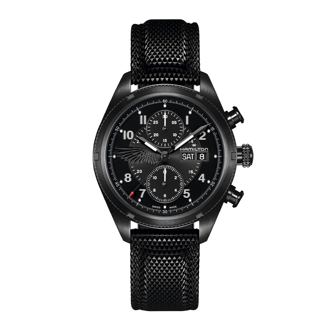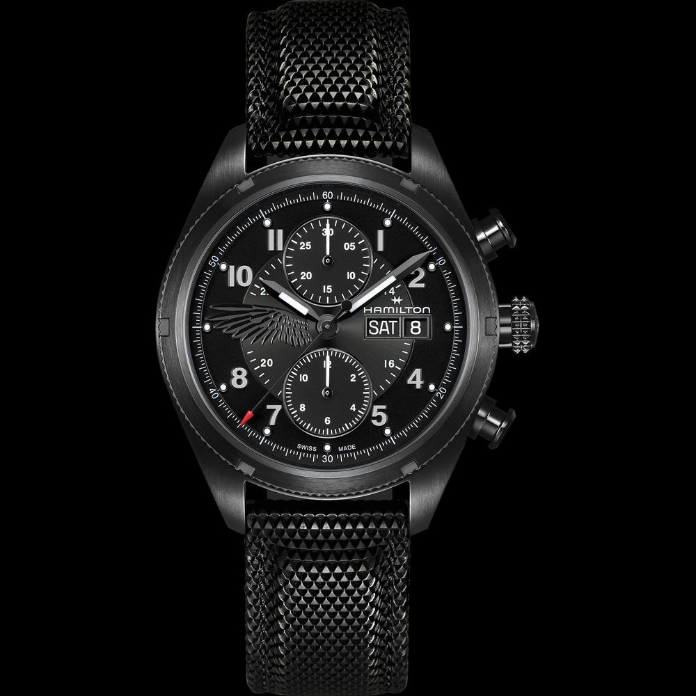 ブラックダイヤル/翼のシンボル/6時位置と12時位置にクロノグラフ サブダイヤル/3時位置に曜日、日付表示 |
