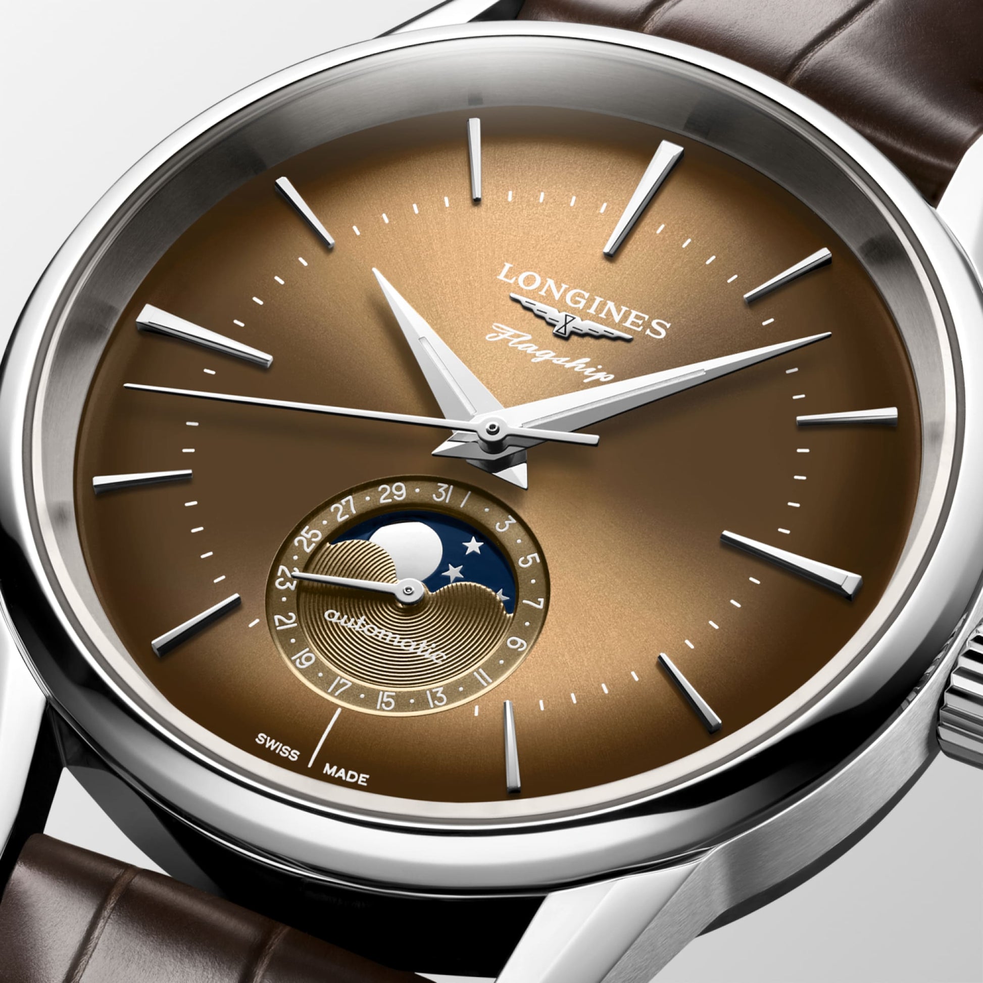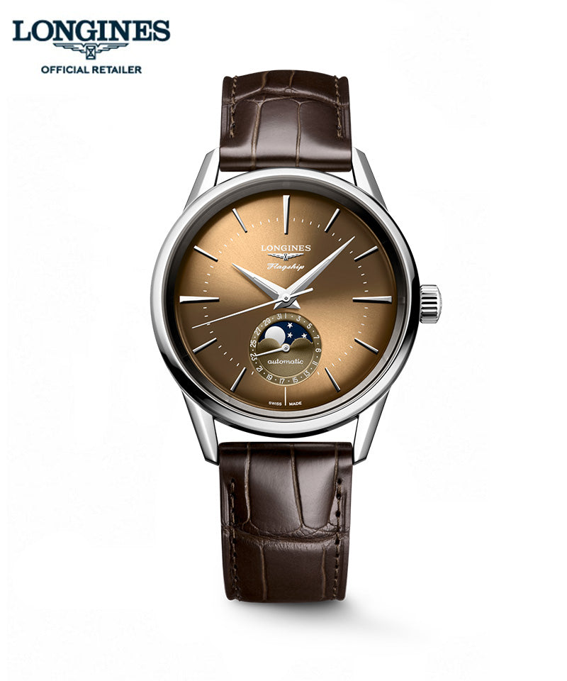 時、分、秒、ムーンフェイズ、6時位置のサブダイアルに日付表示 |