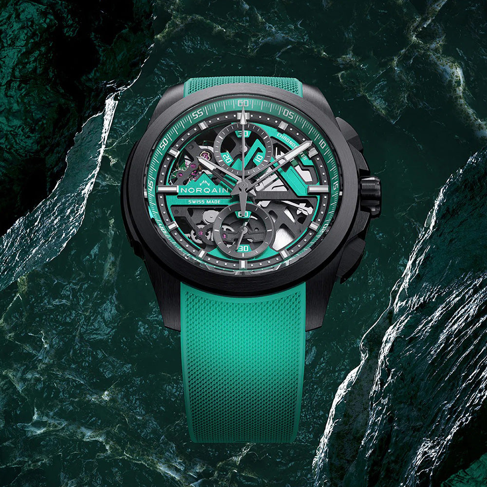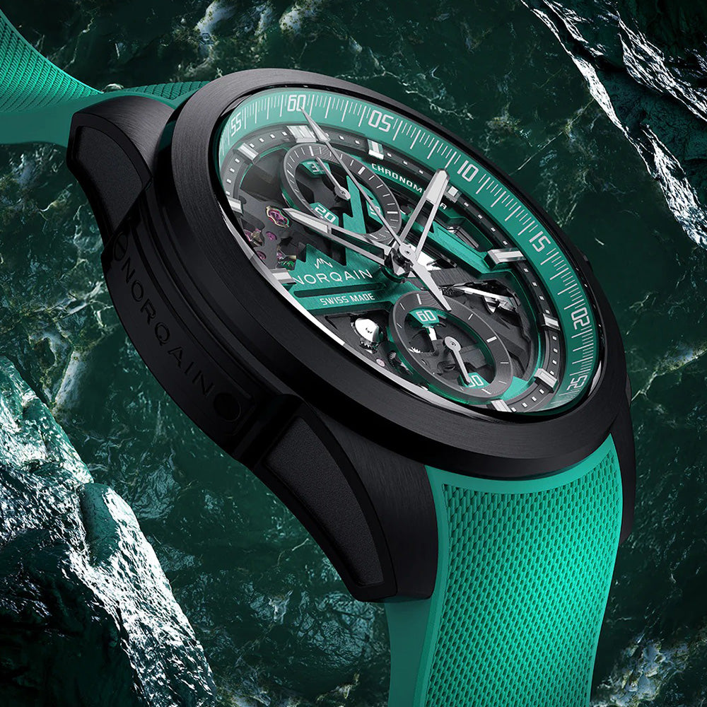 | サテン仕上げのブラック/ジェイドグリーンのスケルトンダイアル ジェイドグリーンのアウターリングにホワイトカラーの目盛 6時、12時位置にブラックのインカウンター ホワイトカラーのノルケインロゴ ダイヤモンドカットされたインデックス, ホワイトカラーのSuper-LumiNova® ダイヤモンドカットされた時分針, ホワイトカラーの Super-LumiNova® ダイヤモンドカットされたクロノグラフ針, ホワイトカラーの Super-LumiNova® ダイヤモンドカットされたスモールセコンド針 |