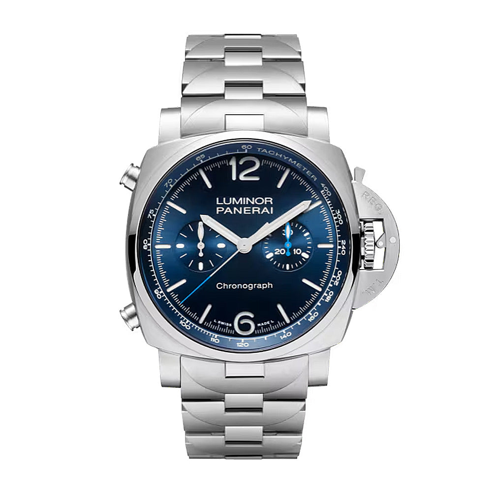 ブルー、サンブラッシュ仕上げ、夜光アラビア数字とアワーマーカー。3時位置に中空のクロノグラフミニッツカウンター、9時位置にスモールセコンドカウンター。中央のクロノグラフ秒針。外部の “ベゼル”にタキメータースケール |