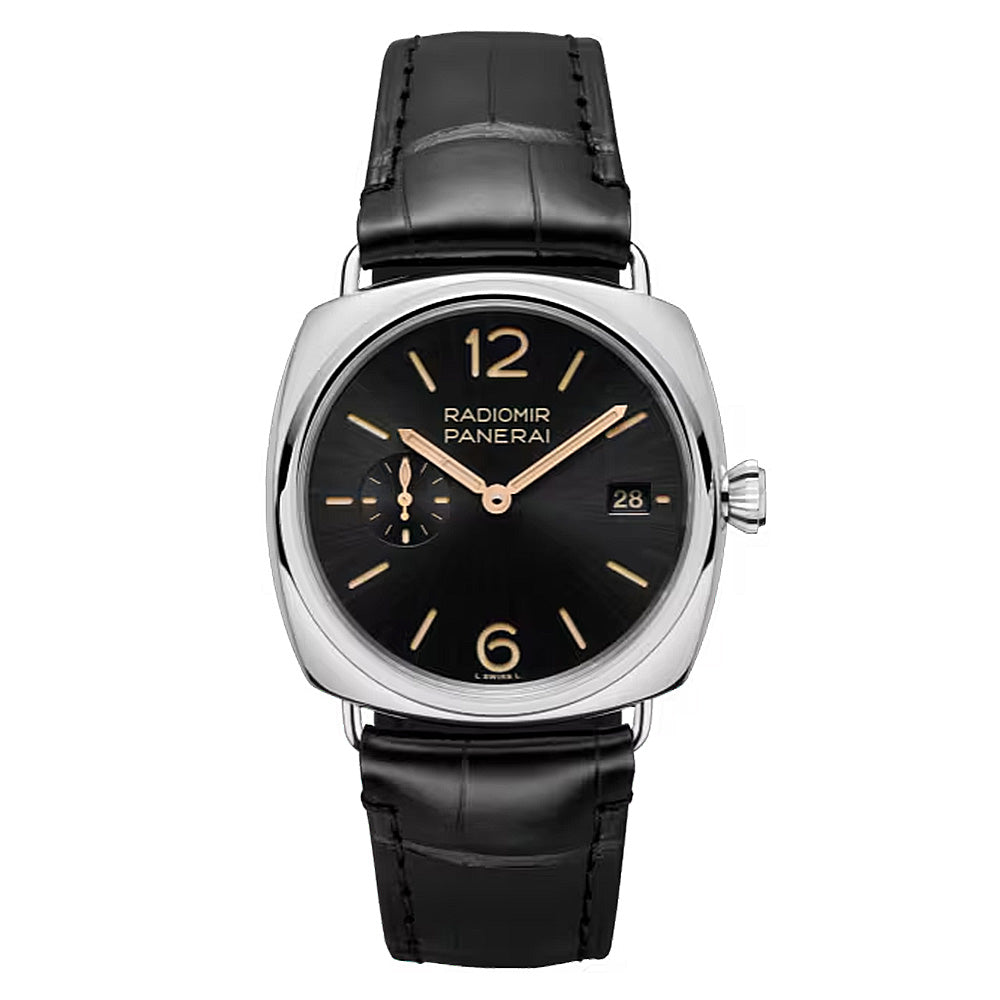 ブラック、サンブラッシュ仕上げ、夜光アラビア数字とアワーマーカー。3時位置に日付、9時位置にスモールセコンド |
