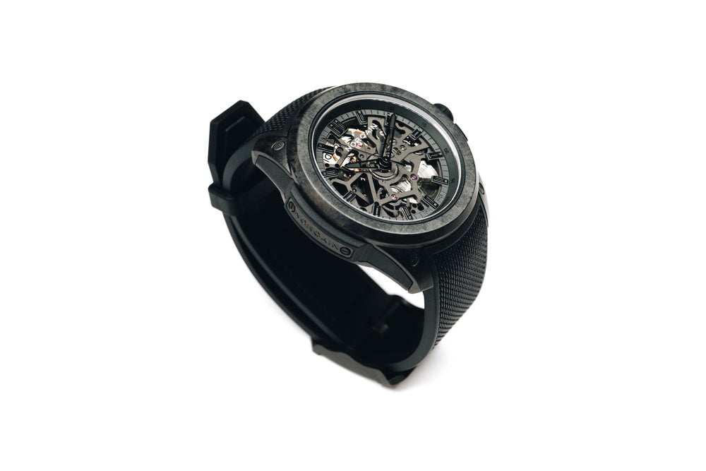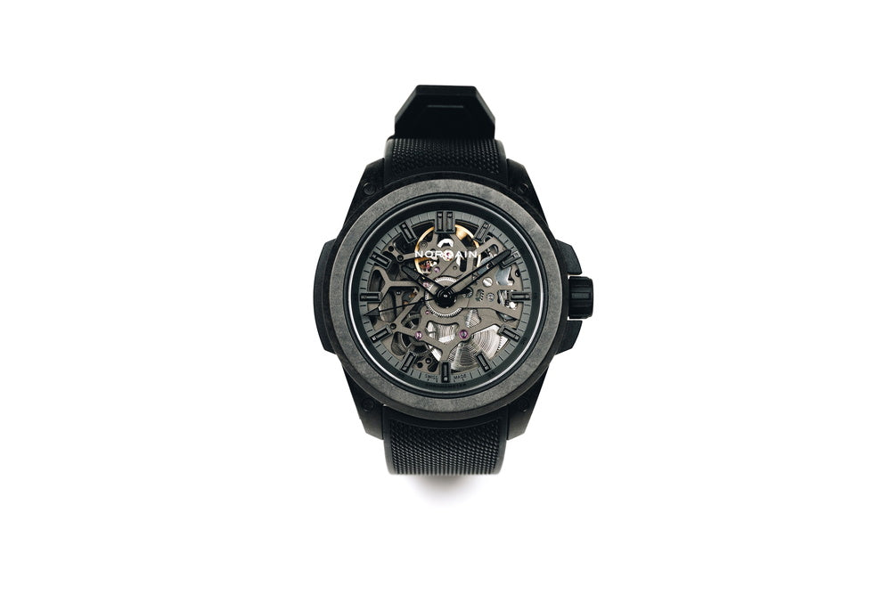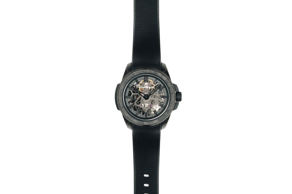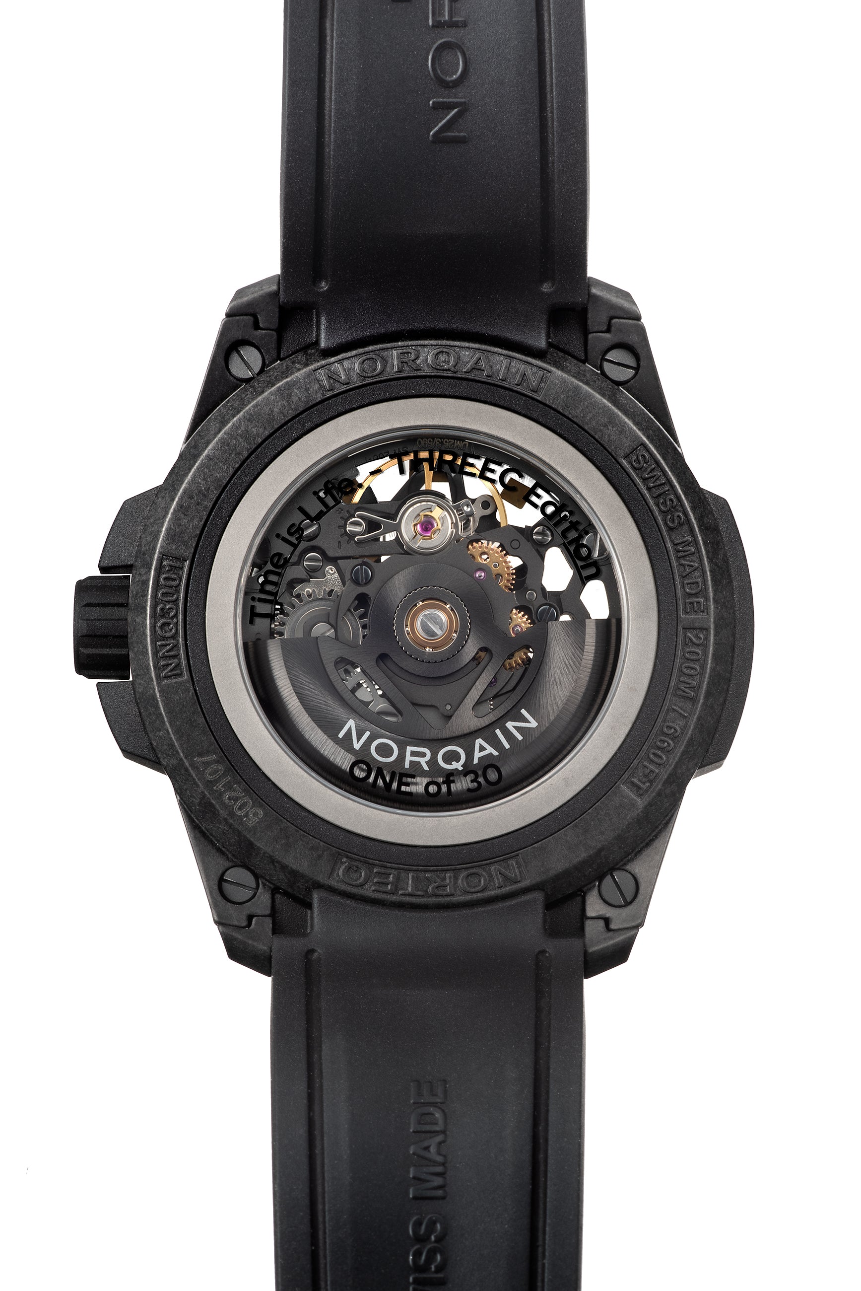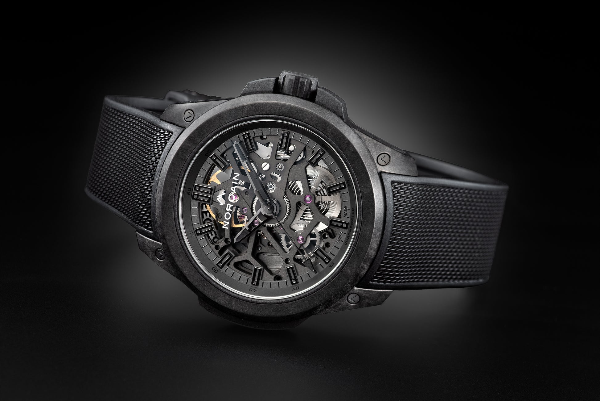 ブラックNORTEQ®、ケース径:39mm、ケース厚:11.75mm、ストラップ幅:20mm、ケース最大長:45.75mm、防水性200m、ケースサイドにノルケインプレートを装着 |